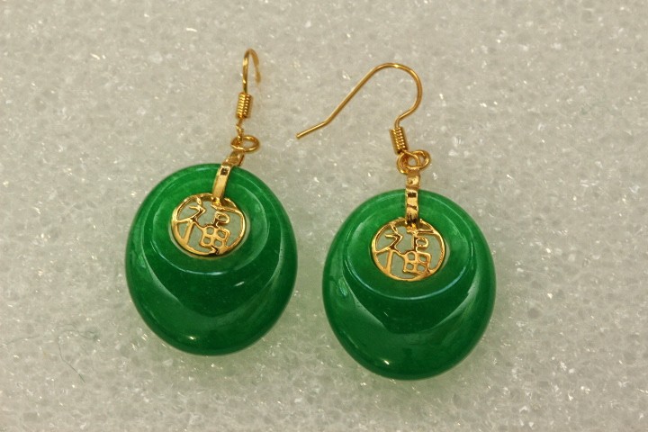 These Apple Green Jade earrings have the Chinese character for Good Luck in the middle and are made with a custom style “PI” cut stones, and set into this fine Gold earring setting. To Chinese culture this “PI” shaped symbolizes balance in life. The stones were hand cut and polished to a fine finish, and the quality of the Jade, color, clarity and translucency of the stones is excellent. The size of the stone is 22mm by 22mm.