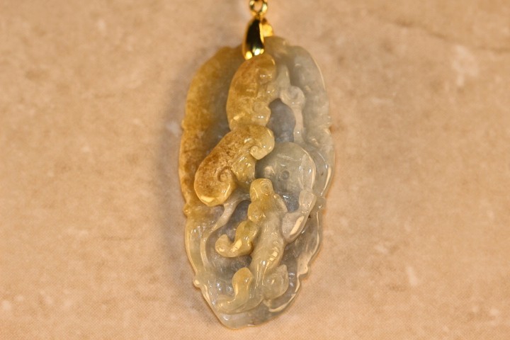 This pendant is hand carved with great detail. It is a Chinese badger with Chinese Coins. The Chinese Badger symbolizes determination, focus and confidence and the Coins symbolize wealth and fortune in the Chinese culture. The pendant is very detailed and has been hand carved by a well known Chinese Master Jade Carver. The colors are light Lavender and Russet Jade. The colors and clarity of this Jade piece is excellent. The translucent quality is also excellent.