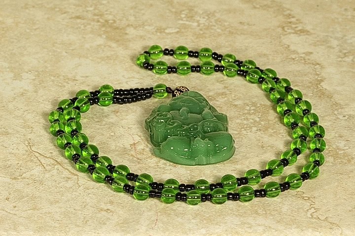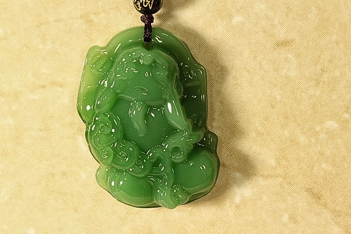 This is a beautifully hand carved Jade Pendant of the Chinese Dragon. The Chinese Dragon is also one of the signs of the Chinese Zodiac. The Chinese Dragon brings good luck and happiness and also symbolizes strength, loyalty and longevity according to Chinese culture. This pendant has been hand carved in great detail by a fourth generation master Jade carver. The color of this Jade is a gorgeous Apple Green. The quality, clarity and color of this Jade pendant is excellent. The translucent quality is also excellent. The pendant is attached to a Chinese Silk cord with 6mm Jade beads and is adjustable from 14″ to 22″.