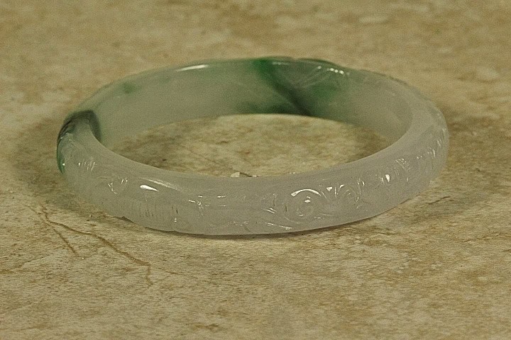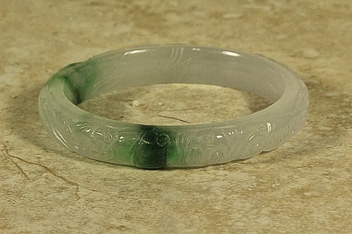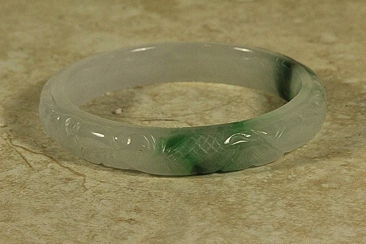 This is a beautifully hand carved Jade Bangle of the Lotus Flower Vines, Good Luck and the Chinese blessings. The Lotus Flower symbolizes purity, harmony, well-being and freedom of earthly cares also according to Chinese culture. The Chinese Blessing also hand carved into this Jade bangle is the blessing for “Everything that you wish and will come true”. The Bangle also has the Chinese symbol for Good Luck. This Bangle has been hand carved in great detail by a fourth generation Chinese Master Jade Carver. The Jade colors of this bangle are two shades of Apple Green Jade, a gorgeous contrast in Jade colors. The quality, color and clarity of this piece is Icy and excellent. The translucent quality is also excellent. It is flawless throughout (no chips, fractures or marks).
