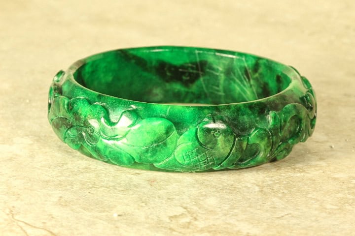 This Bangle is an excellently hand carved bangle of the Chinese Blessing and the Chinese Good Luck Fish. The Chinese Blessing is that “Everything will work out the way you want them to work out” according to Chinese culture. The Chinese Good Luck Fish symbolizes that you will be blessed with Good Luck all year around. The color of this bangle is a beautiful marbled Dark Apple Green Jade and Black Jade. It is very detailed and has been hand carved by a fourth generation Chinese Master Jade Carver. The quality, color and clarity of this Jade is excellent. The translucent quality is also excellent.