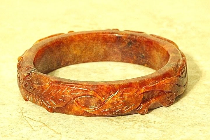 This Gorgeous Jade Bangle has been hand carved with great detail with the hand carved figures on this bangle of the Chinese Dragon and Phoenix. The Dragon is one the Chinese Zodiac signs. The Chinese Dragon symbolizes strength, loyalty, and longevity according to Chinese culture, and the Phoenix is the most beloved mythical bird and symbolizes peace, joy and prosperity according to Chinese culture. The color Jade of this bangle is gorgeous and rare Russet Jade This Bangle has been hand carved in great detail by a well-known Chinese Master Jade Carver. The quality, color and clarity of this Jade Bangle is excellent, The translucent quality of this Jade is good. It is flawless throughout (no chips, fractures or marks).
