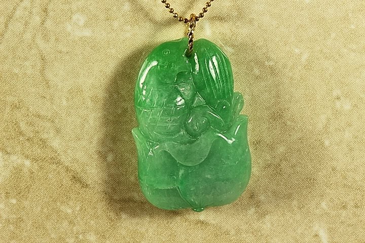 This is a fine quality hand carved Jade Chinese Lucky Fish with a Lotus Flower Pendant. The Chinese Lucky Fish symbolize a surplus and abundance for the coming year and good fortune and blessing according to Chinese culture. The Lotus flower symbolizes purity, harmony and well being, and freedom of earthly cares according to Chinese culture. This pendant is very detailed with intricate open work and has been hand carved by a well known Chinese Master Jade Carver. The color of this Pendant is gorgeous Apple Green Jade. The quality, and color of this Jade is excellent. The translucent quality is also excelent.