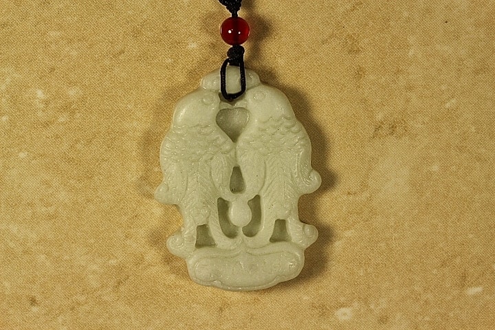 This Jade pendant has a pair of beautifully hand carved Chinese Magpie Birds with Chinese Blessings. The Chinese Magpie Bird symbolizes Intelligence, Love, Joy, well-being and  Happiness according to Chinese culture. The Magpie Birds are also setting on the Chinese Blessing that “all you want and wish for will come true”.  This Gorgeous pendant  has been hand carved by a well-known fourth generation Chinese Master Jade Carver. The color is a pure White Jade. The quality, clarity and color of this Jade pendant are excellent. The translucent quality is also good. This pendant is on a Chinese Silk adjustable cord, adjustable from 14 inches to 21 inches.