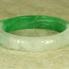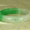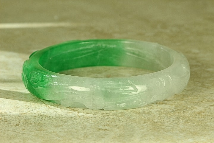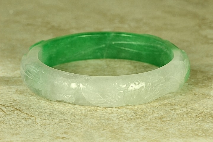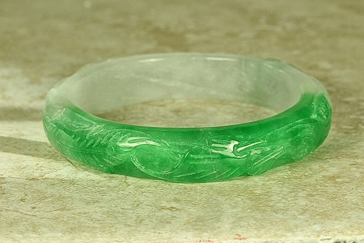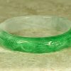 This Jade Bangle has been hand carved with great detail. It is a Chinese Dragon and Phoenix. The Dragon is one the Chinese Zodiac signs. The Chinese Dragon symbolizes strength, loyalty, and longevity according to Chinese culture, and the Phoenix is the most beloved mythical bird and symbolizes peace, joy and prosperity according to Chinese culture. The colors Jade of this bangle is gorgeous Apple Green Jade and White Jade. This Bangle has been hand carved in great detail by a well-known Chinese Master Jade Carver. The quality, color and clarity of this Jade Bangle is excellent, The translucent quality of this Jade is Icy Jade (very,very translucent). It is flawless throughout (no chips, fractures or marks).