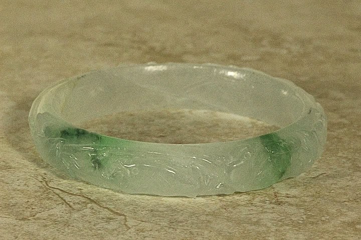 This is a fine quality hand carved Chinese Lucky Fish with a Lotus Flower Jade Bangle. The Chinese Lucky Fish symbolize a surplus and abundance for the coming year and good fortune and blessing according to Chinese culture. The Lotus flower symbolizes purity, harmony and well-being, and freedom of earthly cares according to Chinese culture. This Bangle was very hand carved with great detail by a well-known Chinese Master Jade Carver. The colors of this Jade Bangle are very clear and very translucent Icey Jade with two spots of Apple Green Jade. The quality, color and clarity of the Jade is excellent. The translucent quality is also excellent. It is flawless throughout (no chips, fractures or marks).