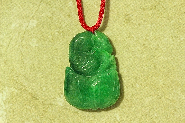 This is a fine quality hand carved Jade Chinese Lucky Fish with a Lotus Plant pendant. The Chinese Lucky Fish symbolize a surplus and abundance for the coming year and good fortune and blessing according to Chinese culture. The Lotus flower symbolizes purity, harmony and well being, and freedom of earthly cares according to Chinese culture. This pendant is very detailed with intricate open work and has been hand carved by a well known Chinese Master Jade Carver. The color of this Jade pendant is gorgeous Apple Green Jade. The quality, color and clarity of this Jade is excellent. The translucent quality is also excellent.