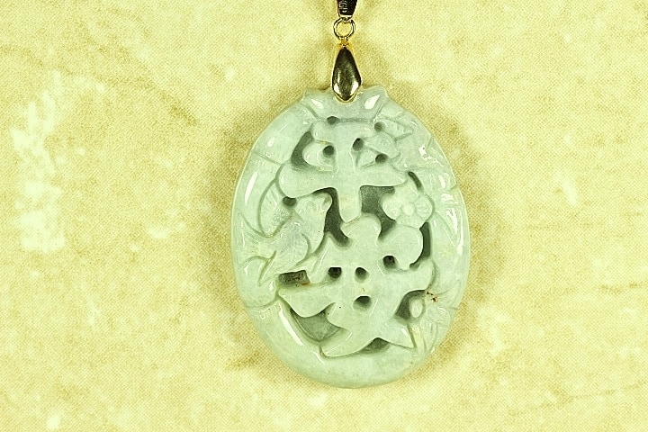 This Jade pendant has a pair of beautifully hand carved Chinese Magpie Birds, Lotus and with Chinese Blessings for peace. The Chinese Magpie Bird symbolizes Intelligence, Love, Joy, well-being and Happiness according to Chinese culture. The Lotus Flower symbolizes Harmony, Peace, Purity and Well being from all Earthly Cares also according to Chinese culture. This Gorgeous pendant has been hand carved by a well-known fourth generation Chinese Master Jade Carver. The color is a gorgeous pure Light Apple Green Jade. The quality, clarity and color of this Jade pendant are excellent. The translucent quality is also very good.