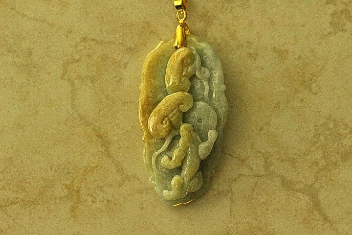 This pendant is hand carved with great detail of the Chinese Dragon with Chinese Coins, and blessings. The Chinese Dragon symbolizes good luck, strength and loyalty, the Chinese coins symbolize wealth and fortune in the Chinese culture. There are also Chinese carvings on the pendant for “All the things that you want and wish for will all work out. The pendant is very detailed and has been hand carved by a well-known Chinese Master Jade Carver. The color of the pendant is Light Apple Green Jade with Light Russet Jade. The color and quality of the Jade is excellent. The translucent quality is also excellent.