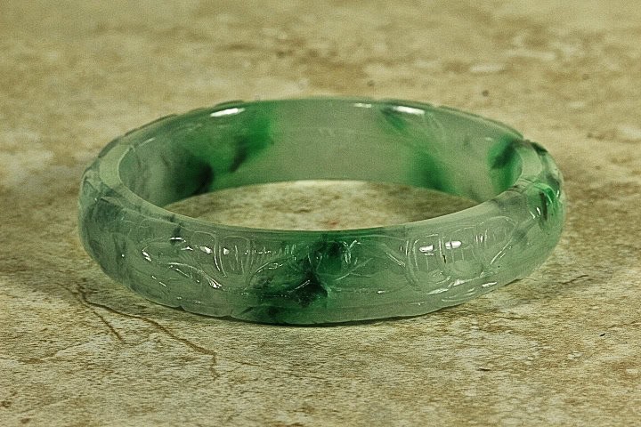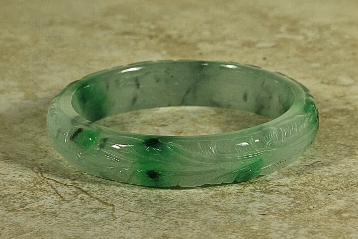 This Jade Bangle was hand carved with great detail with the Chinese symbols for Long Life, Happiness and Good Health, according to Chinese culture. The colors of this Jade bangle is gorgeous and most popular Apple Green Jade with viens of Dark Apple Green Jade. This Bangle has been hand carved in great detail by a fourth generation Chinese Master Jade Carver. The quality, color and clarity of this Jade Bangle is excellent. The translucent quality is also excellent and Icy . It is flawless throughout (no chips, fractures or marks).