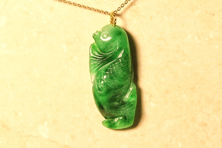 This pendant is an beautifully hand carved Chinese Lucky Fish. The Chinese Lucky Fish symbolizes wealth, harmony and bounty, it also brings an abundance of energy into life, according to the Chinese culture. The color is a gorgeous and popular Emerald Green Jade. The pendant has been hand carved with great detail by a well-known 4th generation Chinese Master Jade Carver. The quality, color and clarity of this Jade pendant is excellent. The translucent quality is also excellent.