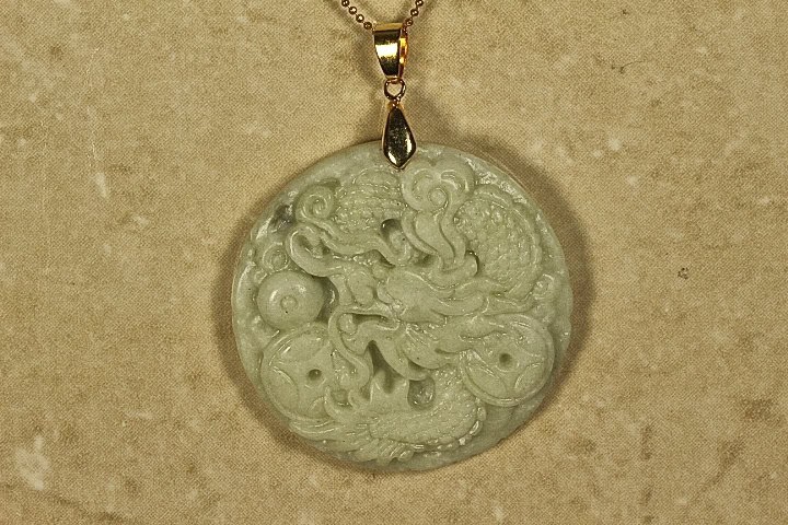 This pendant is an excellently hand carved Chinese Dragon Pendant with two Chinese Lucky Coins. The Dragon is one the most important symbols of the Chinese Zodiac. The Chinese Dragon symbolizes Strength, Loyalty, Longevity and Prosperity, According to Chinese culture. On the reverse side of the pendant are two hand carved Chinese Lucky coins. The Jade used for this pendant is gorgeous and popular White Jade. The pendant is intricately detailed and has been hand carved by a well-known fourth generation Chinese Master Jade Carver. The quality, clarity and color of the Jade is excellent. The translucent quality is very excellent.