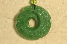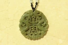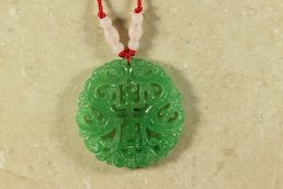 This Jade pendant was hand carved with great detail with the Chinese symbols for long Life and Happiness. According to Chinese culture the wearer is granted with all of these blessing. The color of this Jade bangle are gorgeous rich Emerald Green Jade . This pendant has been hand carved in great detail by a fourth generation Chinese Master Jade Carver. The quality, color and clarity of this Jade pendant is excellent. The translucent quality is also excellent. The pendant includes a Chinese silk cord with three Jade beads on each side. The cord is adjustable from 14 – to 20 inches.