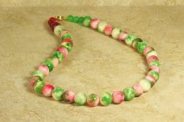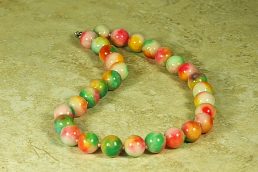 This Necklace is made of 12 mm very fine quality and rare Multi-Colored Jade stones. These Multi-colored Jade stones are not found so much as the other solid Jade colors like the red, green and white Jade in this necklace. Each stone was hand cut and polished by a fourth generation Chinese Master Jade Carver. The quality of the stones are excellent, and the colors of the stones are even more gorgeous than this picture can show. The length of this necklace is 19 inches.