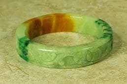This is a beautifully hand carved Jade Chinese Lotus Flower, Chinese Coins and Chinese Blessing Bangle. The Chinese Coins symbolize wealth and fortune. The Chinese Lotus Flower symbolizes purity, harmony, well-being and freedom of earthly cares also according to Chinese culture. This bangle also has carved into it the Chinese Blessing for “Everything that you want and wish for will come true”.  This bangle has been hand carved by a well-known Chinese Master Jade Carver. The gorgeous colors of this Jade bangle are Emerald Green Jade, Russet Jade and Apple Green Jade. The quality, color and clarity of this piece is excellent. The translucent quality is very excellent. The translucent quality is also Icy. It is flawless throughout (no chips, fractures or marks).