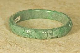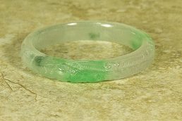 The carvings on this special and very different Jade Bangle are of the Chinese Dragon and the Chinese blessing for “all that you want and desire will come to you” The blessing is carved on both sides of the bangle, so that there are two separate carvings of the blessing. There is also the vine of the lotus plant carved on the top of the bangle, the lotus plant symbolizes purity, honesty good luck and happiness. The color of the Jade bangle is Gorgeous Apple Green Jade with some White Jade. This Jade bangle is especially carved with all of the carving at the top of the bangle. Please note that this bangle is heavy (140 grams).