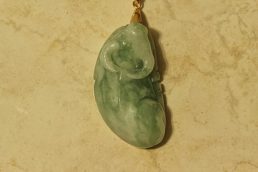 This pendant is an excellently carved Chinese Monkey with an Apple . The Chinese Monkey is one of the Chinese Zodiac signs and symbolizes doing everything well with power and authority, the sign of success. The Chinese Monkey with an Apple represents peace and beauty in Chinese folklore The pendant is very detailed and has been hand carved by a well known Chinese Master Jade Carver. The color is classic dark apple green. The clarity of this Jade piece is excellent. The translucent quality is also excellent
